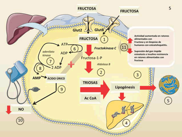 - Al generar glucosa, se almacena en forma de glucógeno de manera limitada e ilimitada en forma de grasa (lipogénesis). Se produce la oxidación de las LDL, resistencia a la insulina e hígado graso no alcohólico.